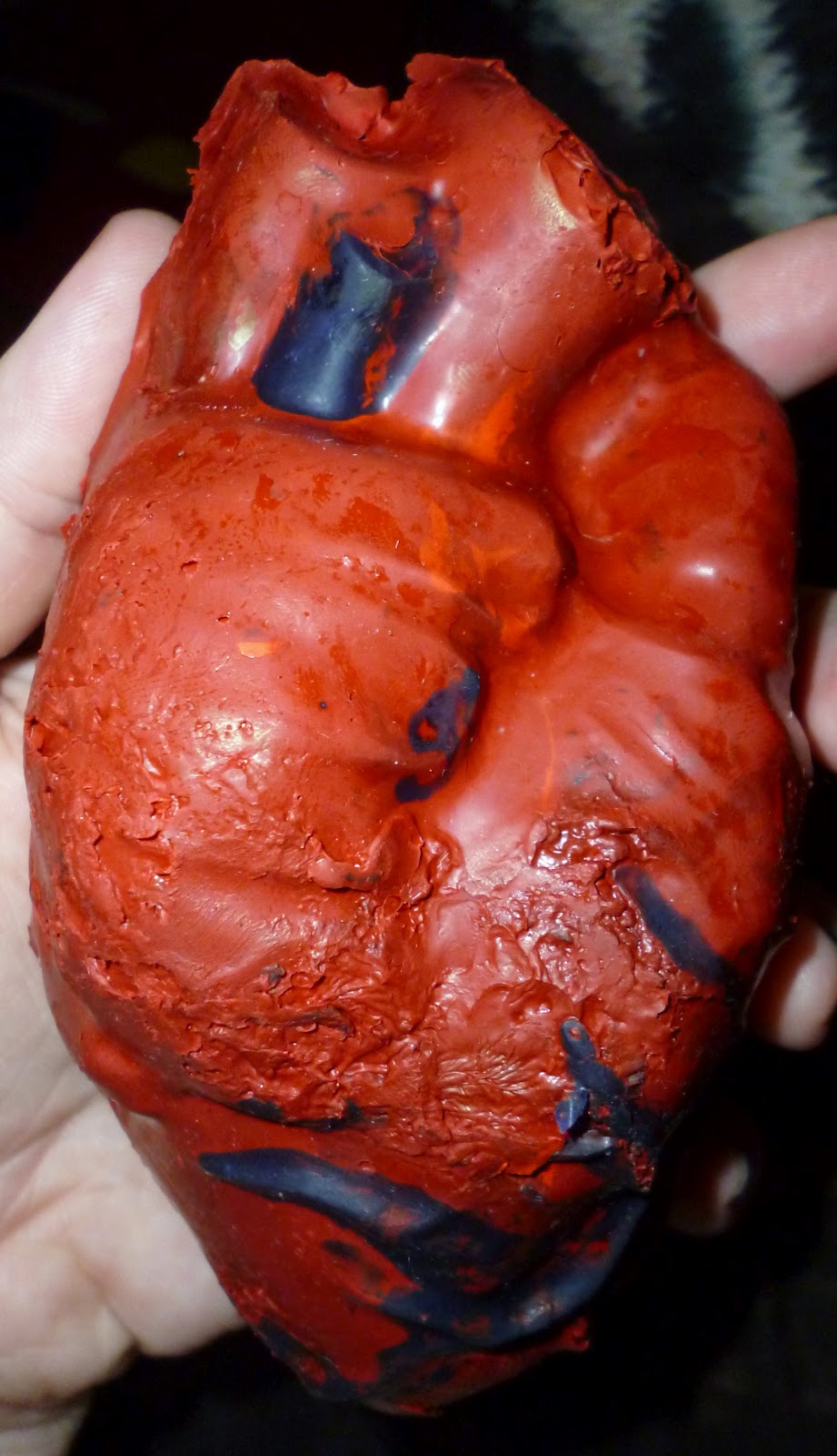 The many layers of latex are finally dry. As you can see the colour has darkened as I mentioned before. By no means is this heart finished, this is just the base. The exterior will be covered in a web of tiny veins and the inside shall have two pumps inserted so that the heart will pulsate, there is still an awful lot of detail needed but I shall keep you posted on my progress.